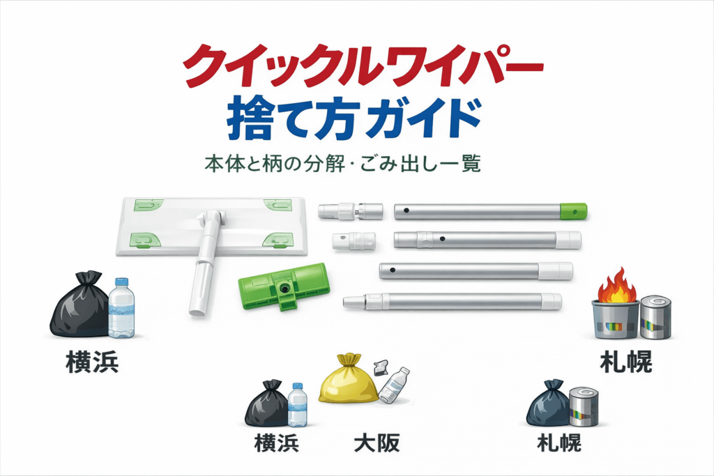 こんな疑問を抱えていませんか。実は、クイックルワイパーの処分ルールは自治体ごとに大きく異なります。たとえば【横浜市】や【大阪市】では、本体の長さや素材によって「燃やせるごみ」「粗大ごみ」「小型金属」に分類され、間違った分別では収集拒否や追加料金につながるケースもあります。